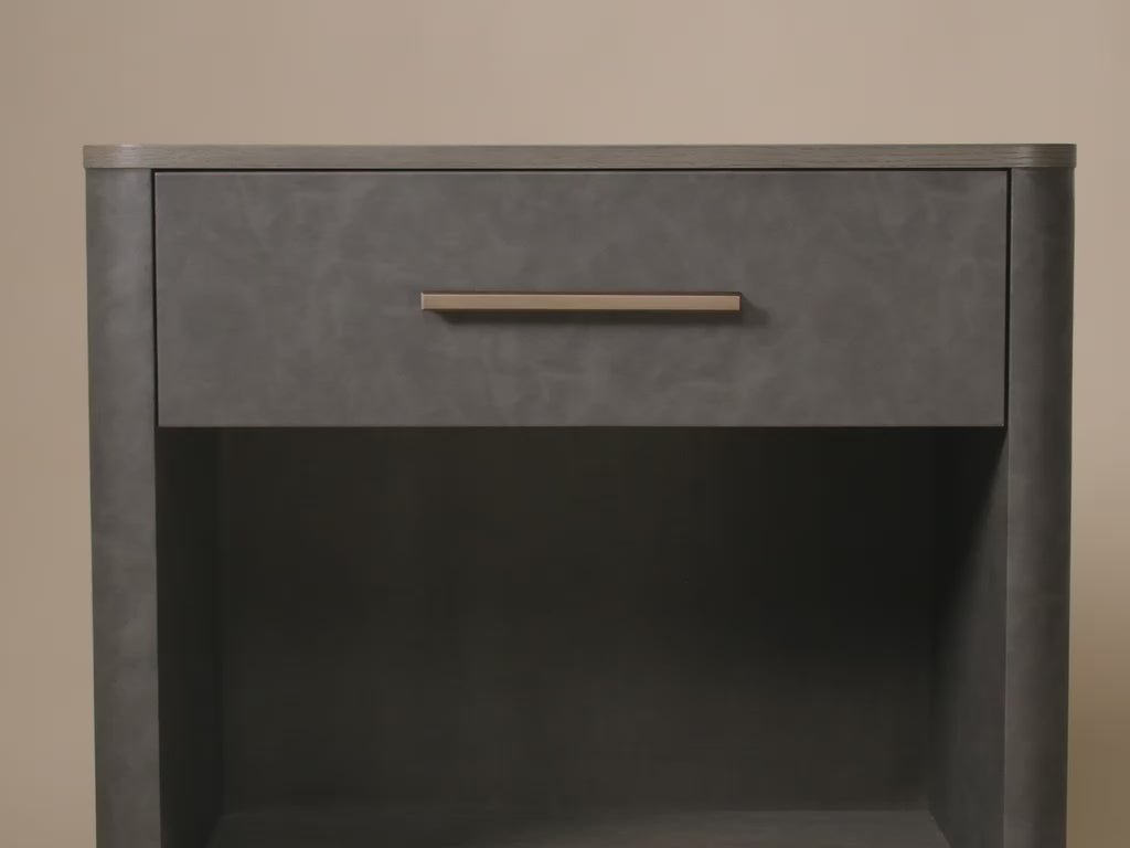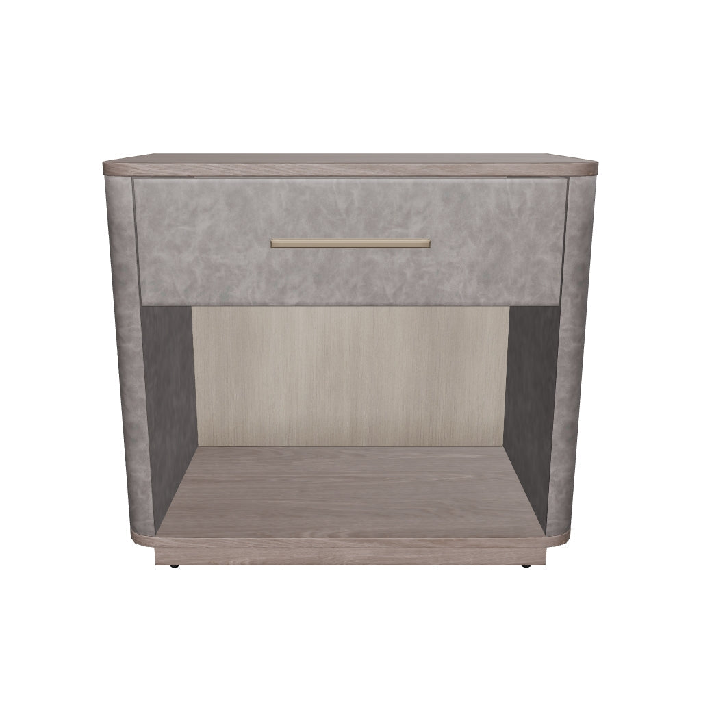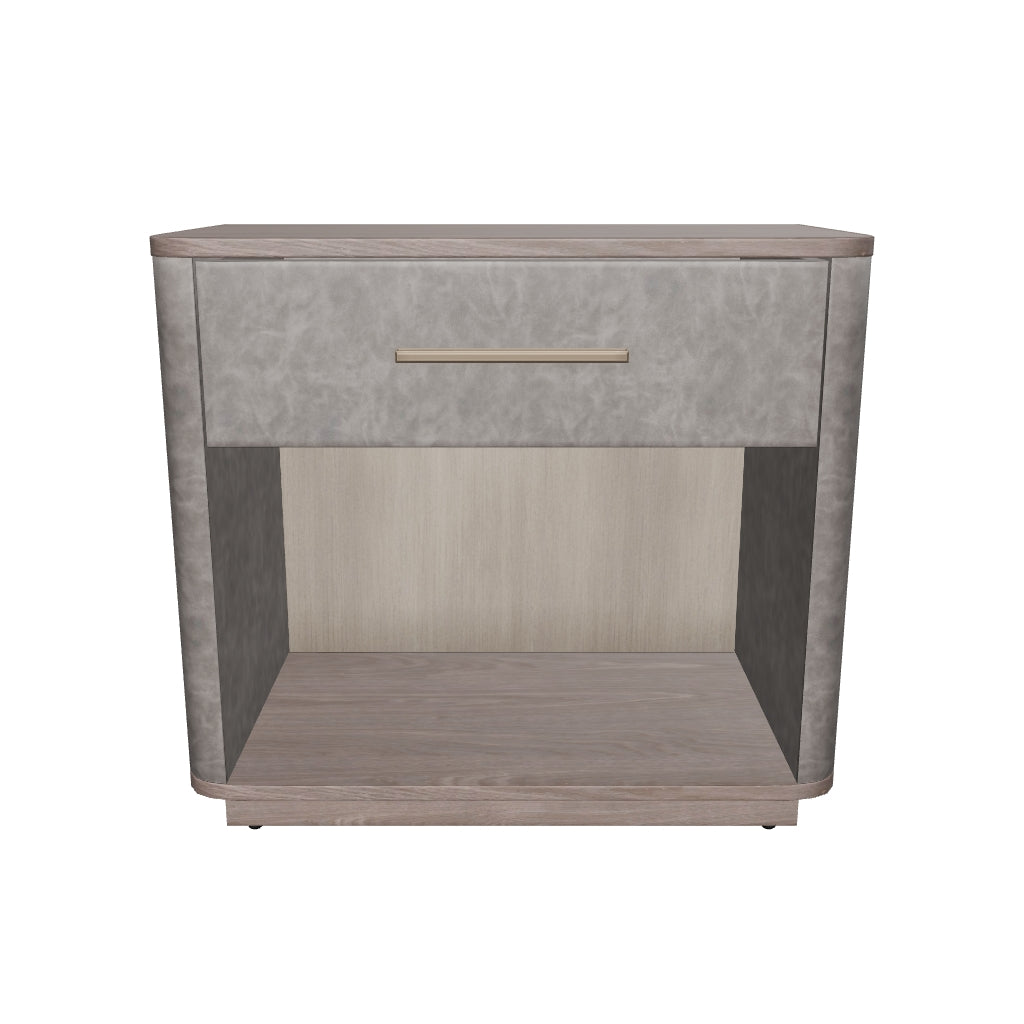 With clean lines and an alluring textured look, the Altman Nightstand reflects a refined expression of shape and form. Designed with a faux leather wrapped frame and one soft closing drawer, a dark grey oak veneer wood top and shelf, and brass stainless steel hardware complete the look.