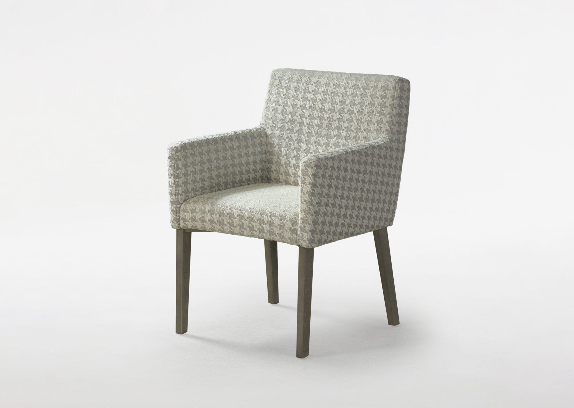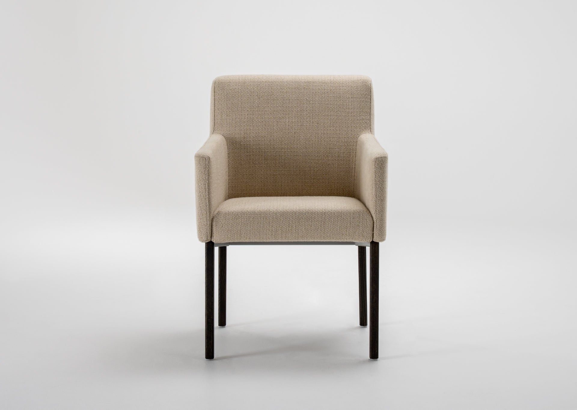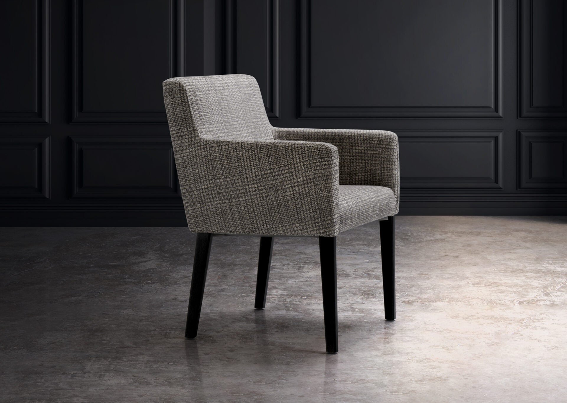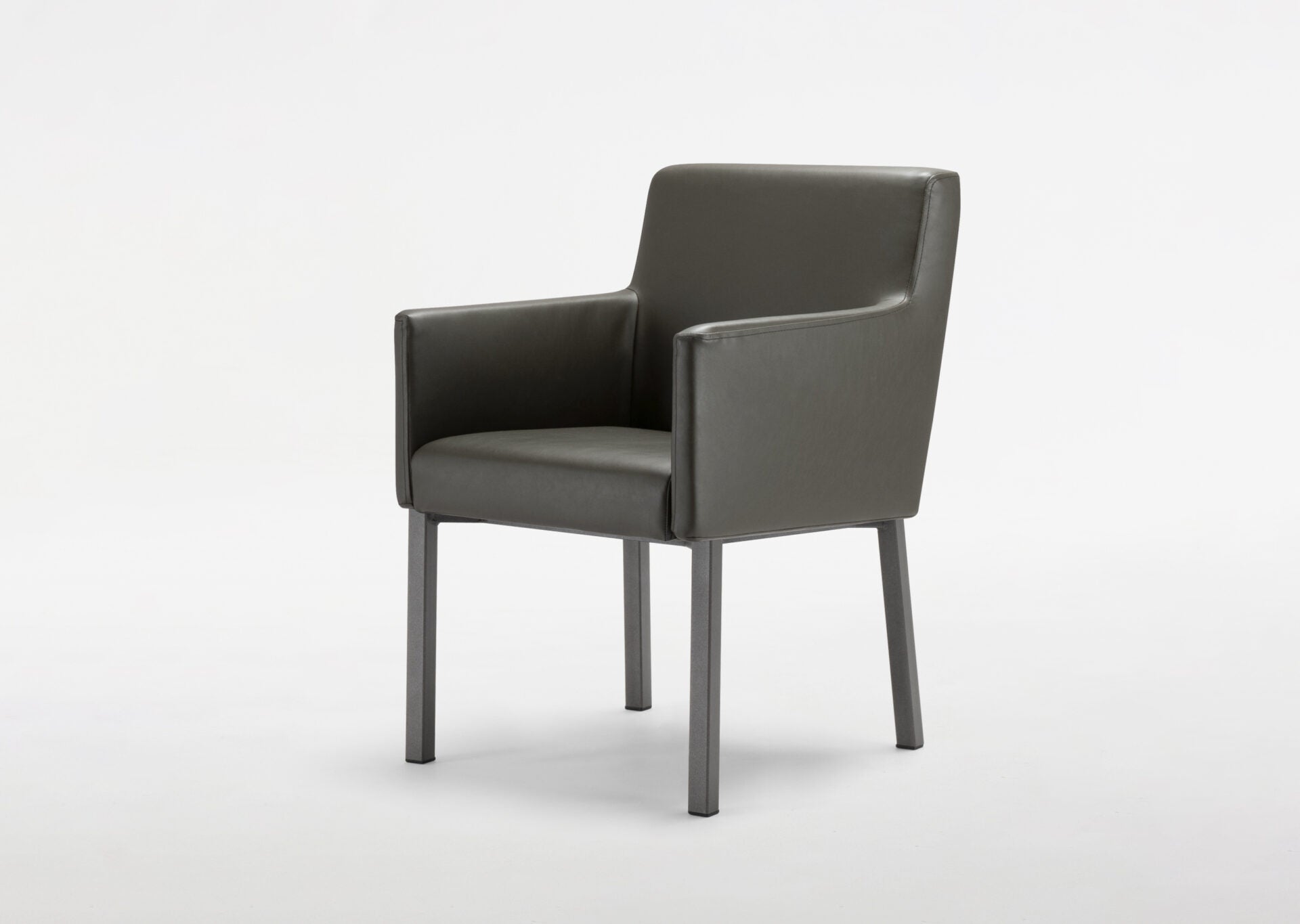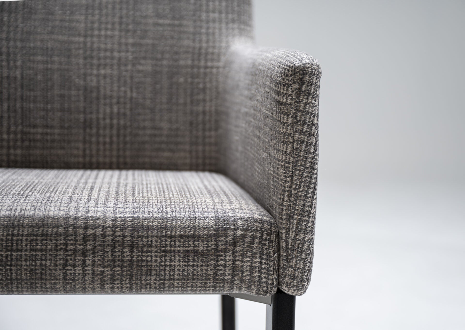 The Anne II chair features a welcoming design with armrests integrated into the backrest, providing both comfort and a cozy appearance. It combines modern aesthetics with high-quality materials, offering options such as fully welded steel legs or solid wood legs.