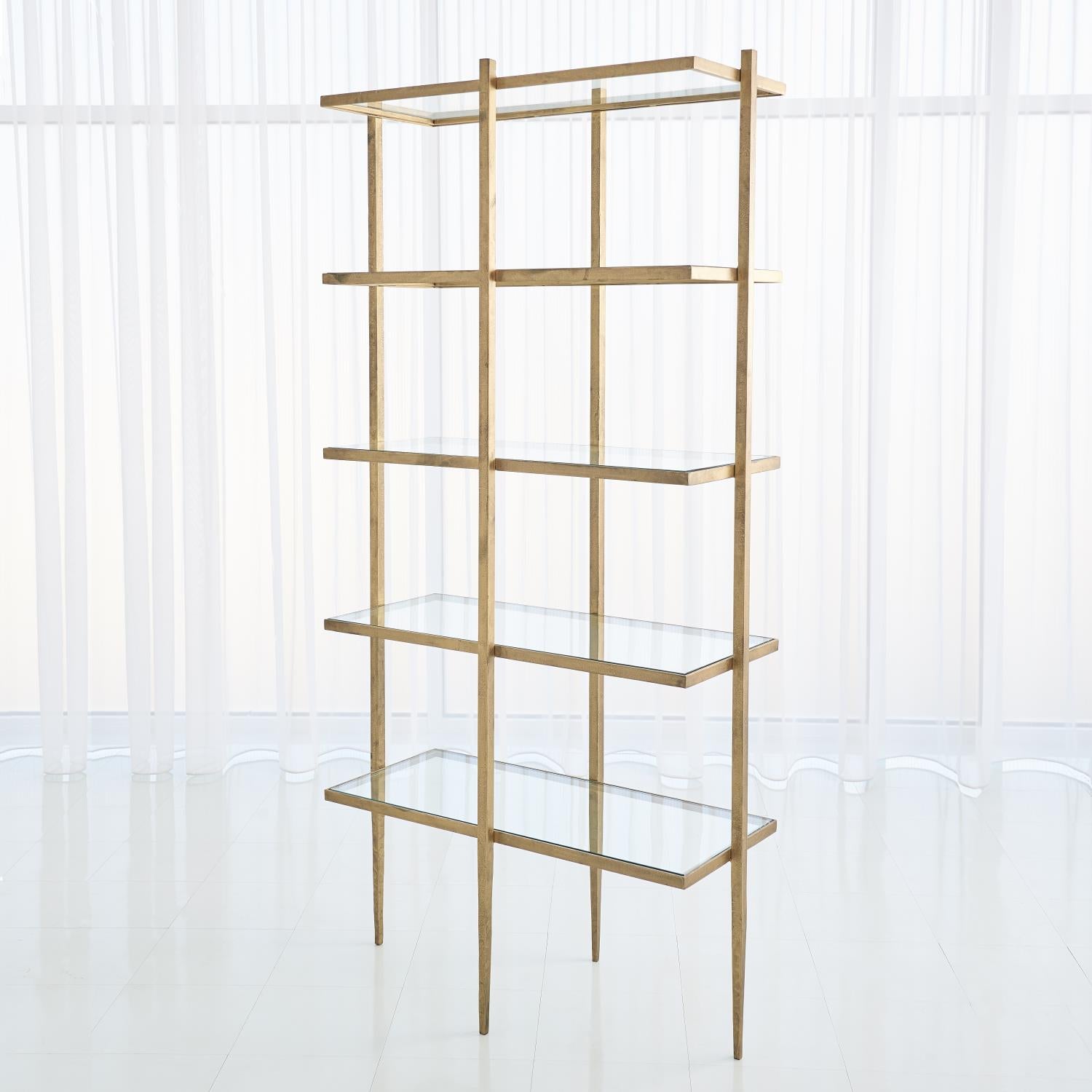 The beautiful shelf features an iron frame with an antique gold finish and five clear, tempered glass shelves. For added design interest, the tapered legs are uniquely positioned at the middle of each side of the étagère as opposed to the corners, which is the typical placement. How beautiful! Also available in a natural iron finish.