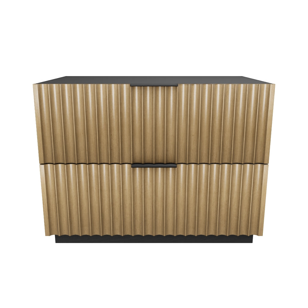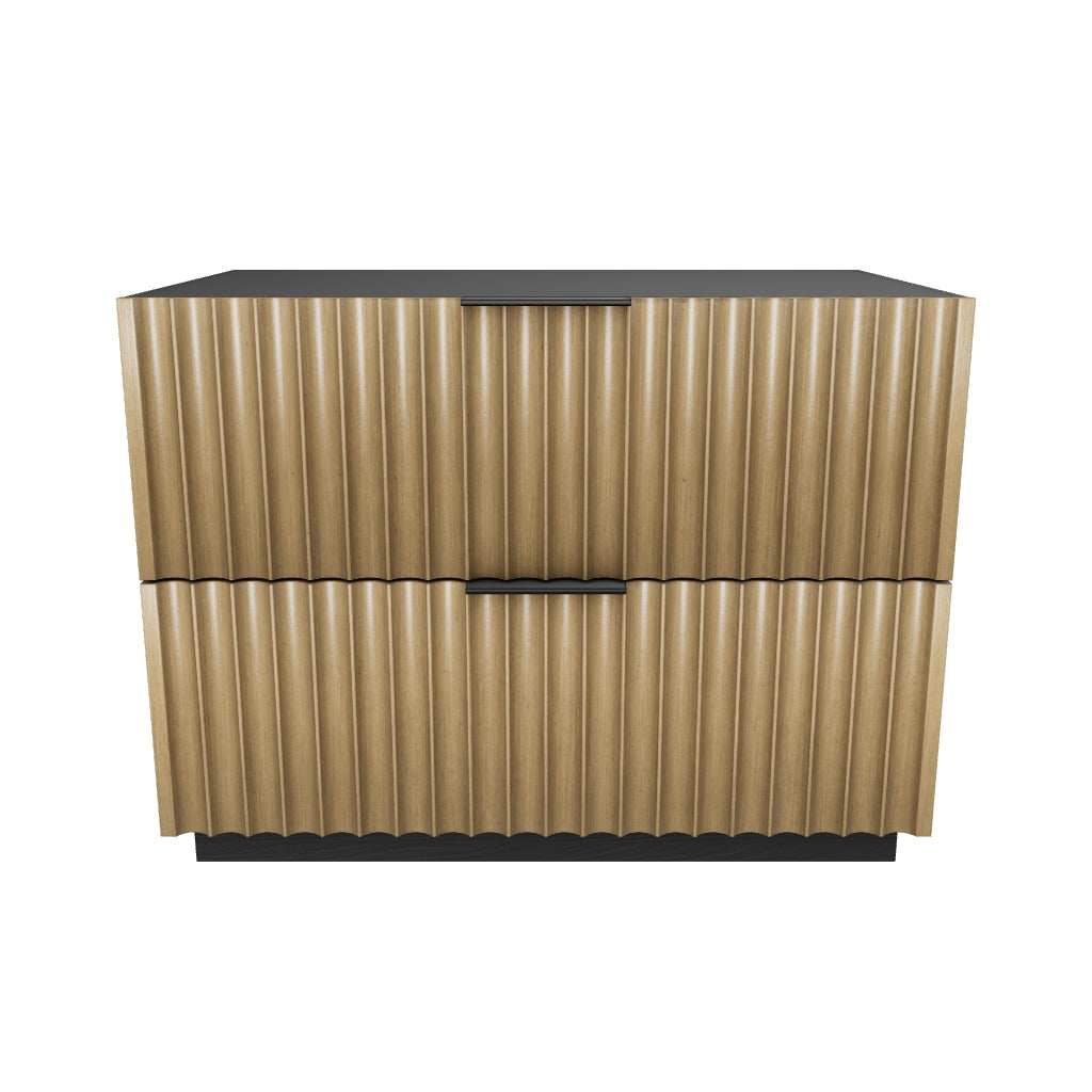 This bold nightstand will command attention in any bedroom space. Features a taupe mango wood frame with dramatic sculpted details on the face of the two drawers. Antique bronze powder-coated aluminum handles complete the modern look. As wood is an organic, porous material, these pieces will contain natural variation of texture and may also exhibit fine indentations and cracks. Wood pieces will also display a disparity of colour and grain, and visible knots and burls that add to the character of each piece. Made in India. With refined craftsmanship, this design was brought to life by skilled local artisans. By nature, these materials develop unique imperfections such as fissures, markings and colour variations for a truly one-of-a-kind piece.