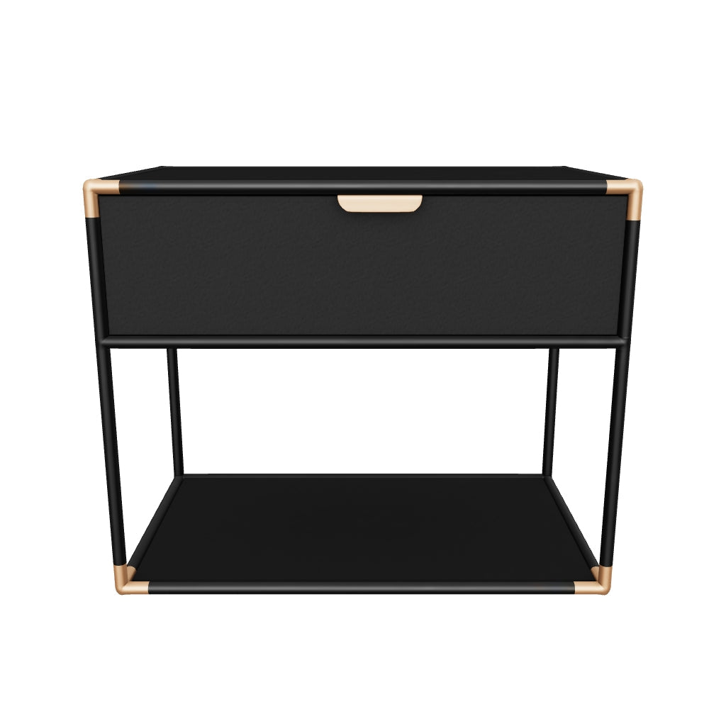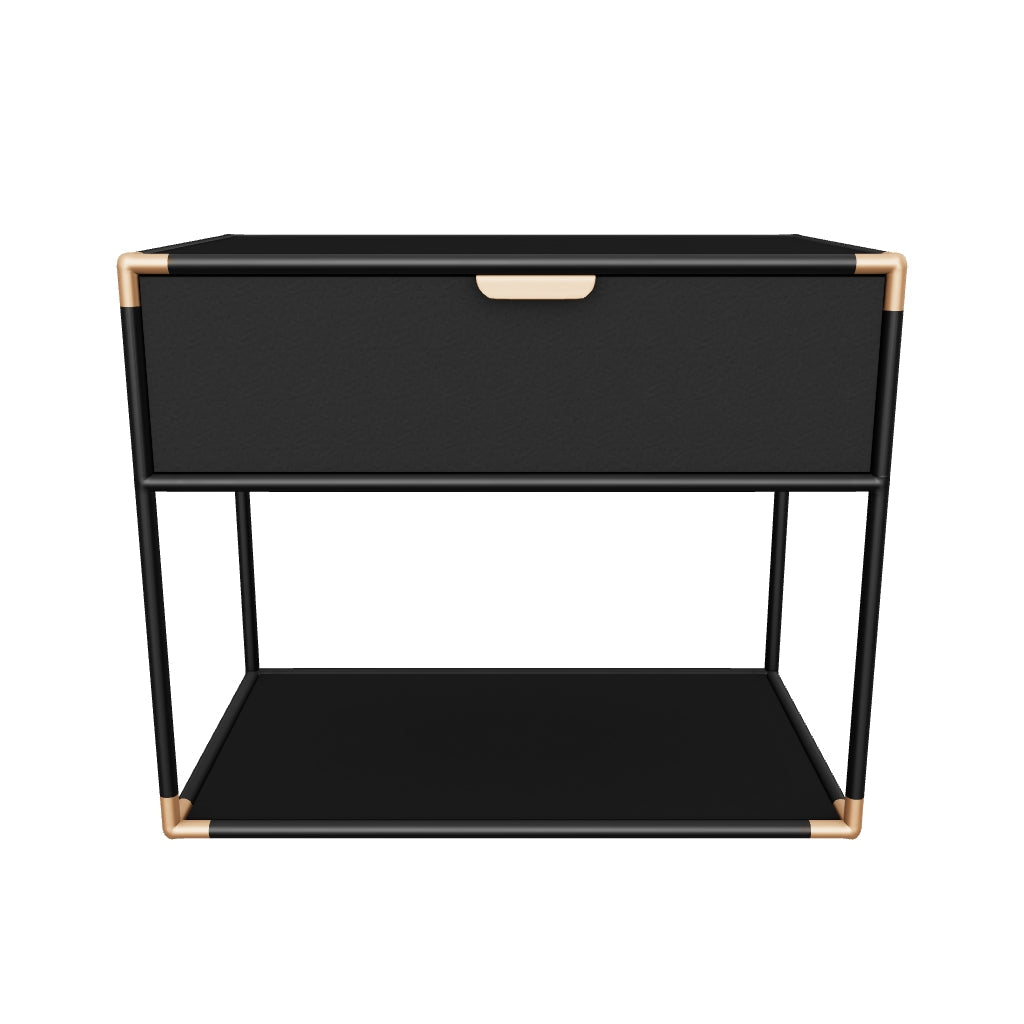 Fully constructed from matte black powder-coated metal, the Doone Nightstand exudes a commanding presence. Matching antique brass handles and hand painted corners elevates the look with complementary contrasting accents. Made in India. With refined craftsmanship, this design was brought to life by skilled local artisans. Due to the nature of handcraftsmanship, unique imperfections such as fissures, markings and variations in colour and shape are welcomed and appreciated characteristics for a truly one-of-a-kind piece.