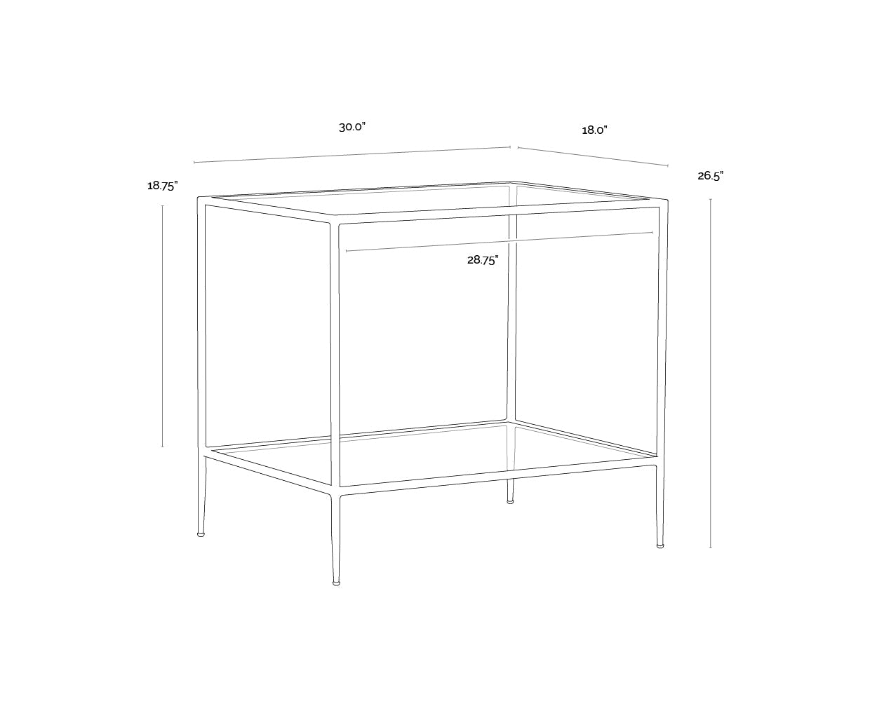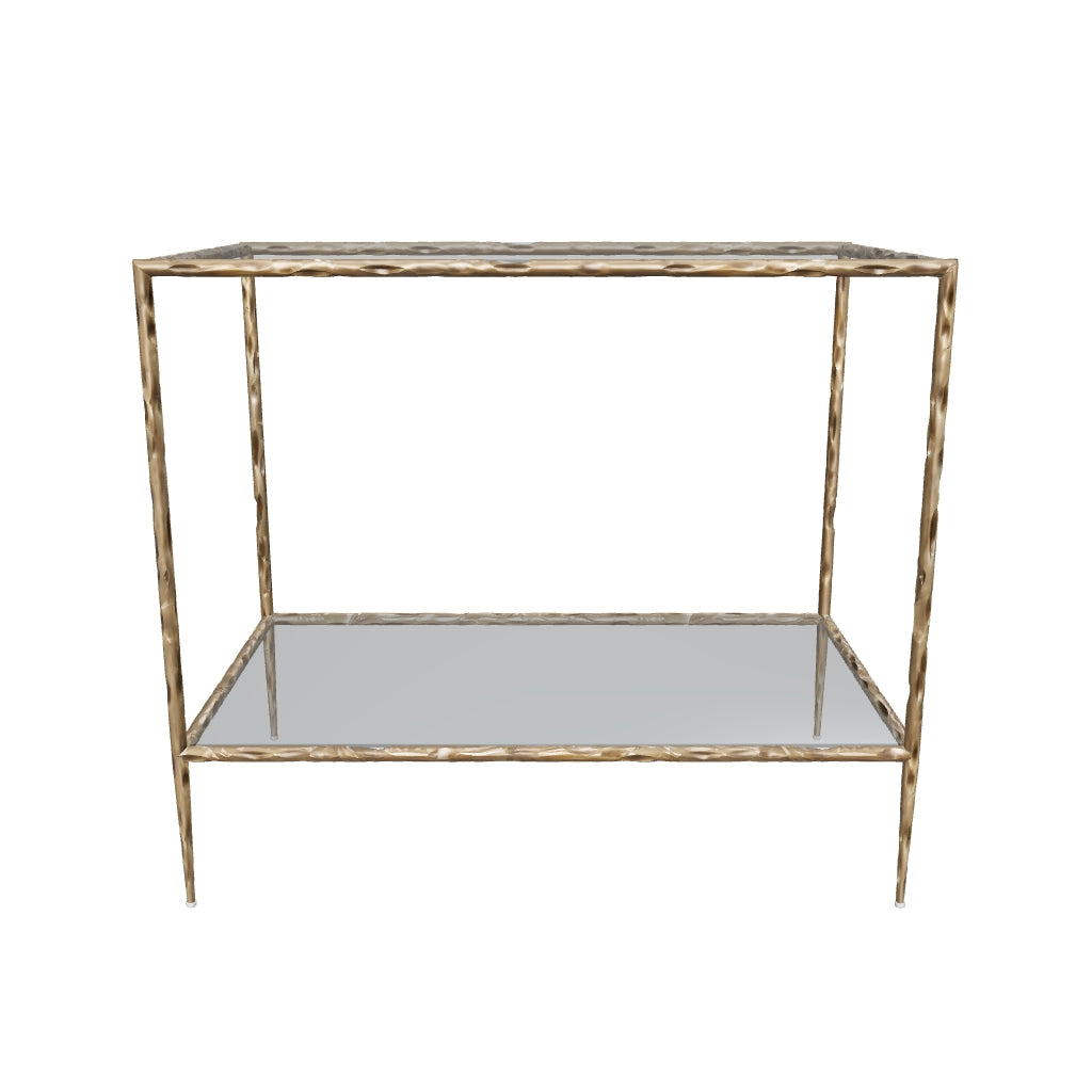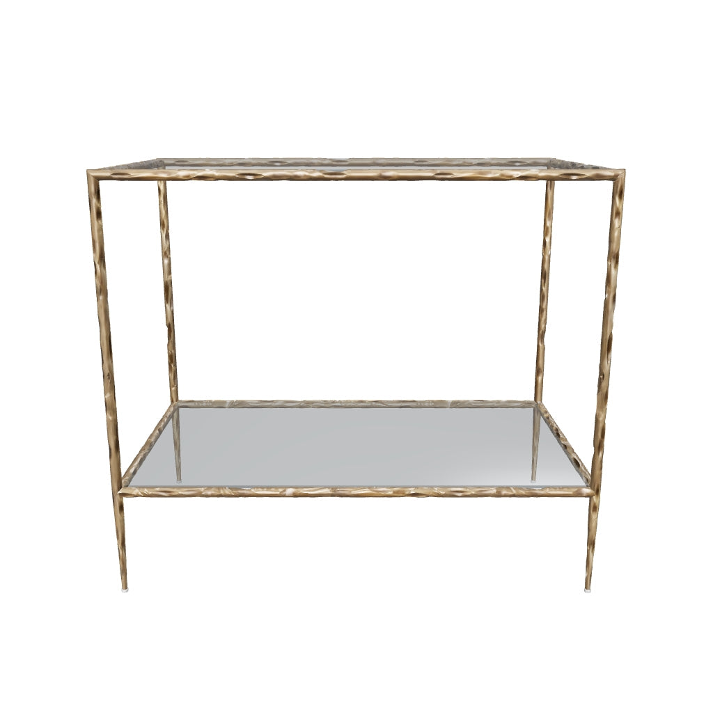 The Emine Nightstand shines a spotlight on the rustic beauty of hand-hammered metal. Crafted by artisans in India, this nightstand features an antique brass iron frame with a tempered glass top and shelf. Made in India. With refined craftsmanship, this design was brought to life by skilled local artisans. Due to the nature of handcraftsmanship, unique imperfections such as fissures, markings and variations in colour and shape are welcomed and appreciated characteristics for a truly one-of-a-kind piece.