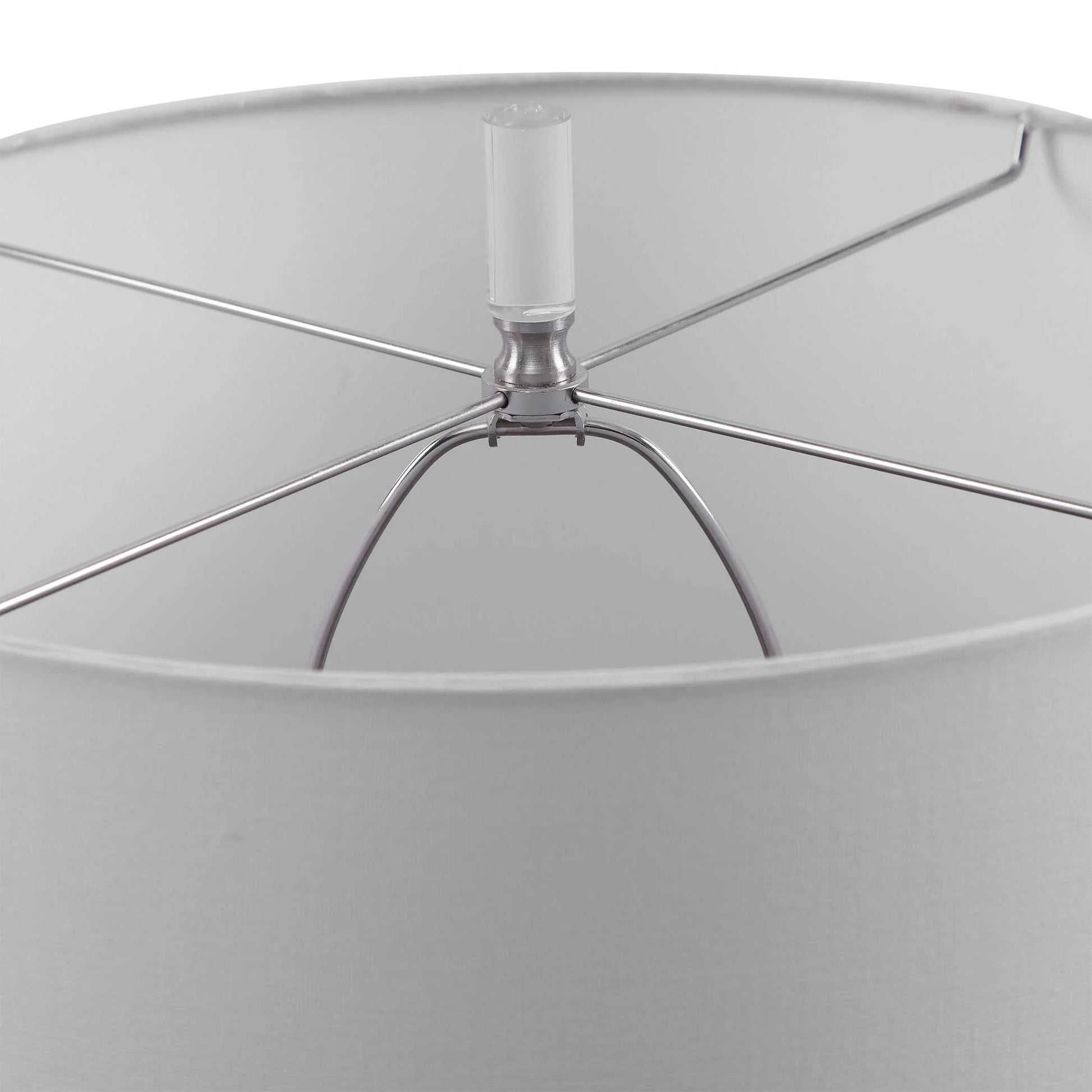 Showcasing an organic shape, this elegant table lamp has a frosted emerald green glass base with brushed nickel and crystal accents. The round drum shade is a white linen fabric.