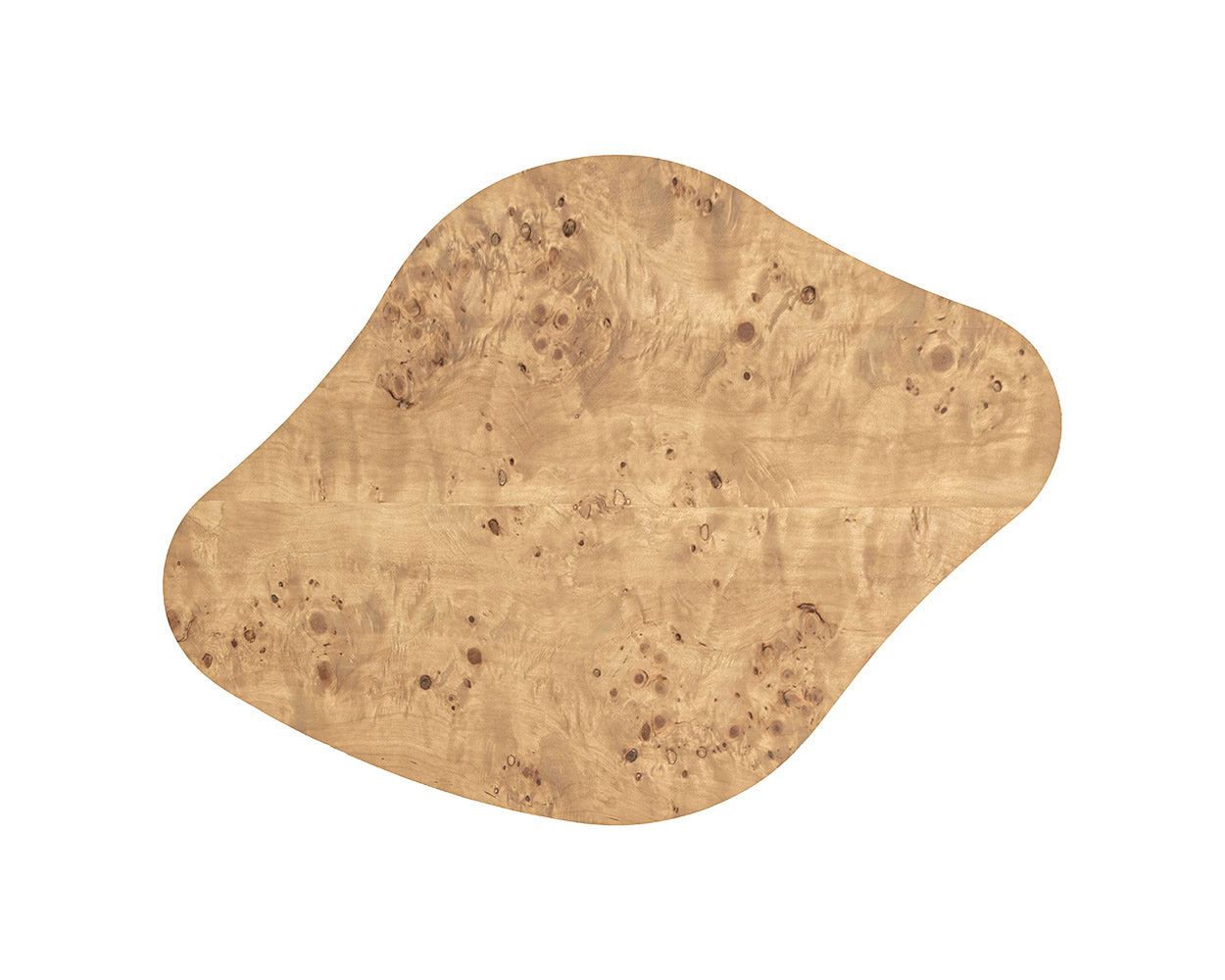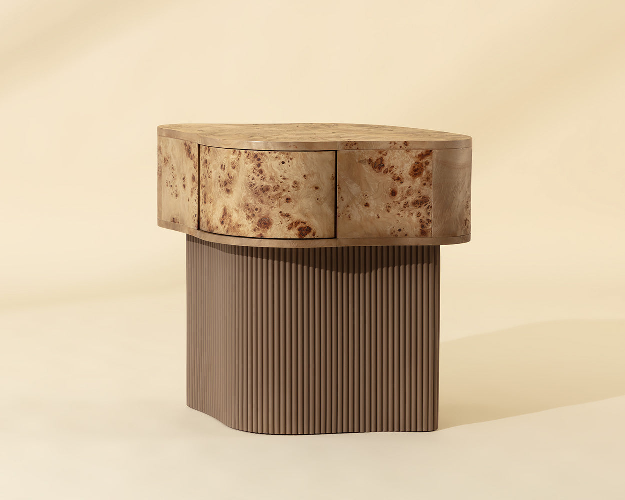 With its freeform silhouette and bold burl grain, the Fern Nightstand makes a striking addition to any space. The asymmetrical top is wrapped in natural burl veneer, showcasing organic, one-of-a-kind patterns. A single push-to-open drawer is seamlessly integrated into the form, set above a ribbed resin base with a lacquered finish.