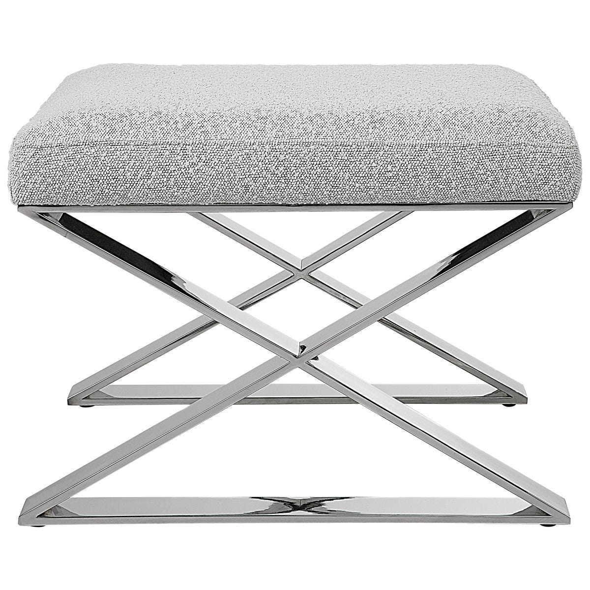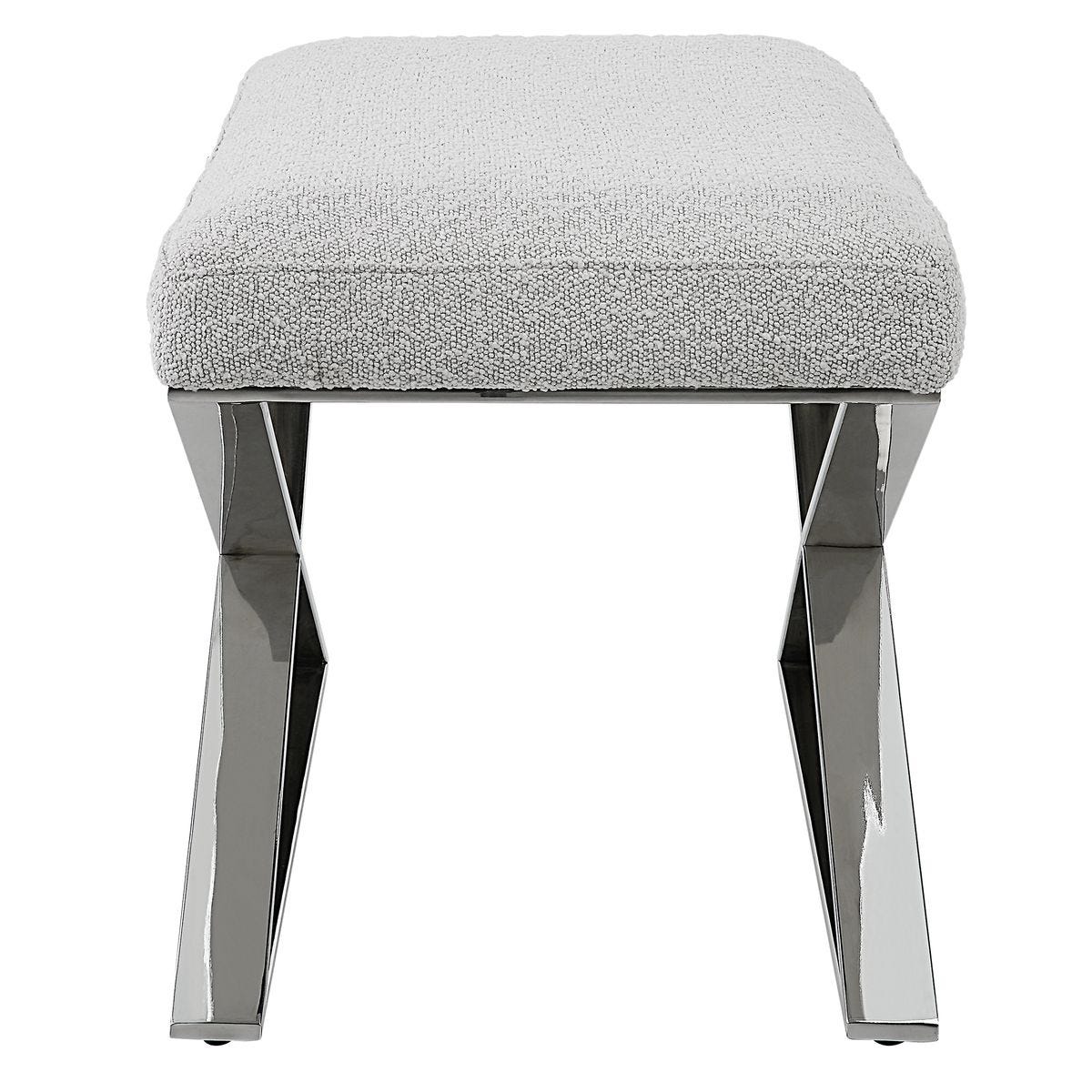 A sumptuous light gray boucle cushion rests atop this streamline steel base with polished chrome finish. The seat size is generous, yet its overall proportions are small enough to fit in a variety of locations.