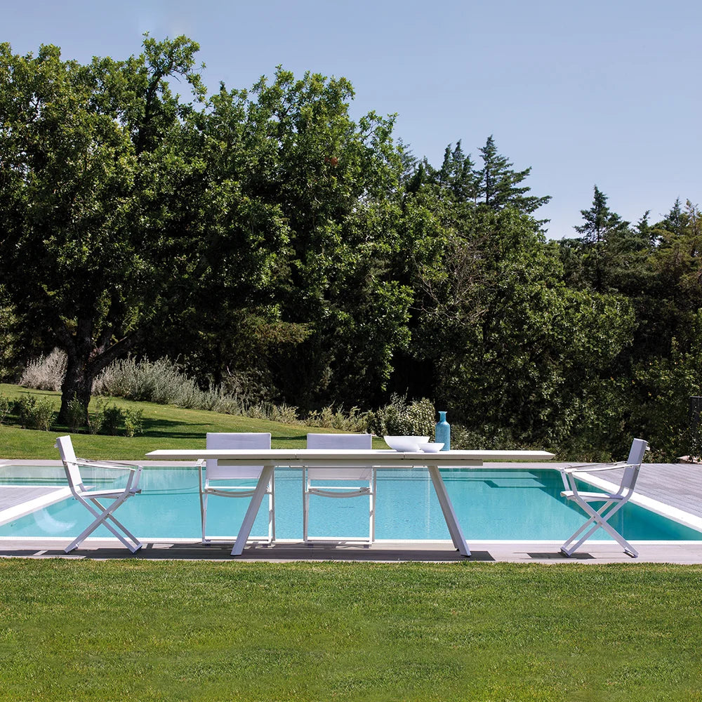 Extension Dining Table, Metal frame design, Water and UV resistant material, Easy to clean Material and Metals are coated with Qualicoat thermosetting powders (Available in Mud Grey or White) Dimensions: 87/126" x 39" x 30"