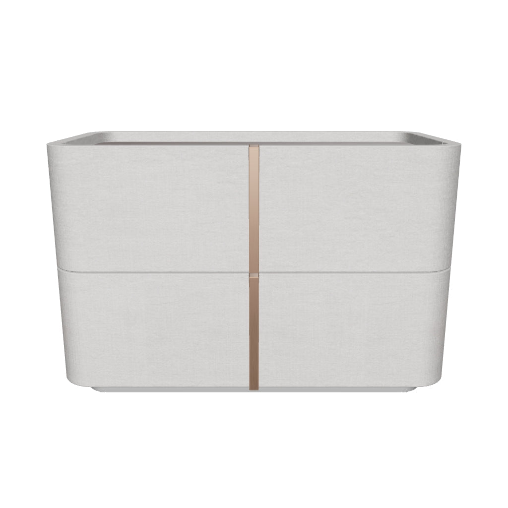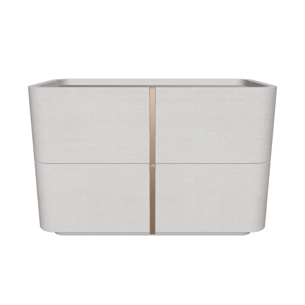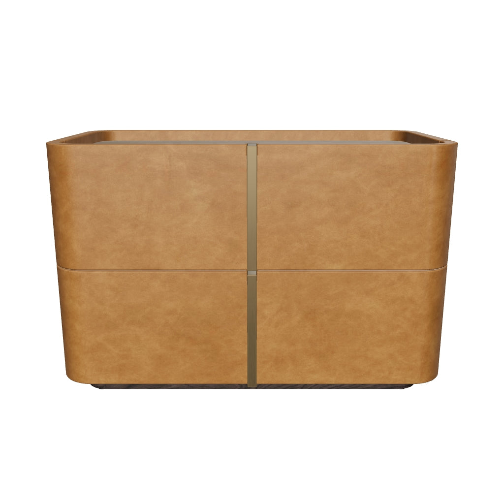 This contemporary large nightstand is defined by its beautiful and gentle curves. Wrapped in cream faux leather with a brown oak veneer tabletop that is sure to impress.