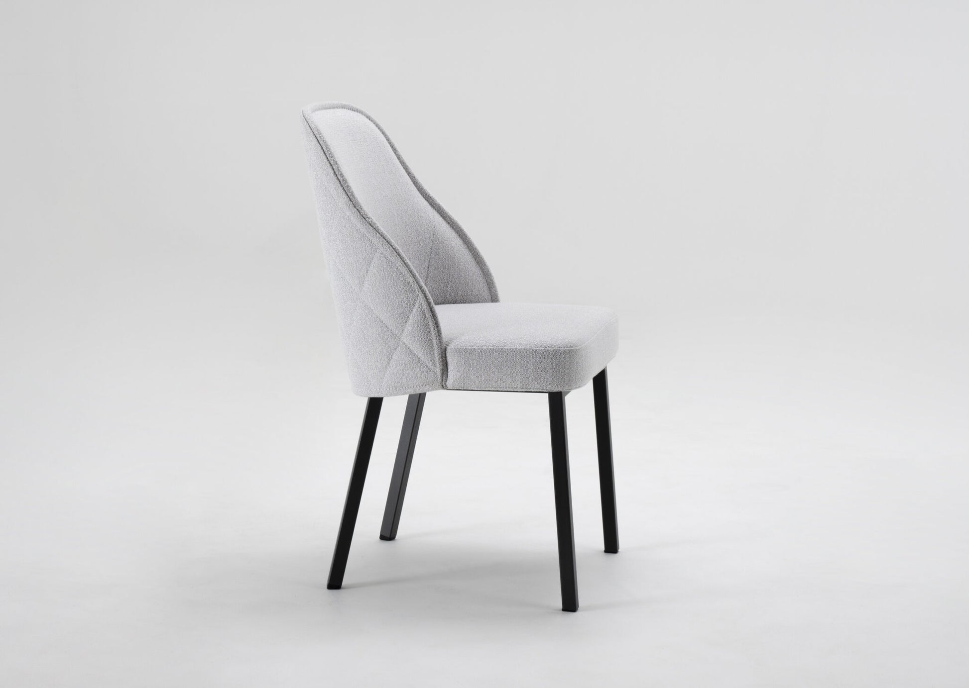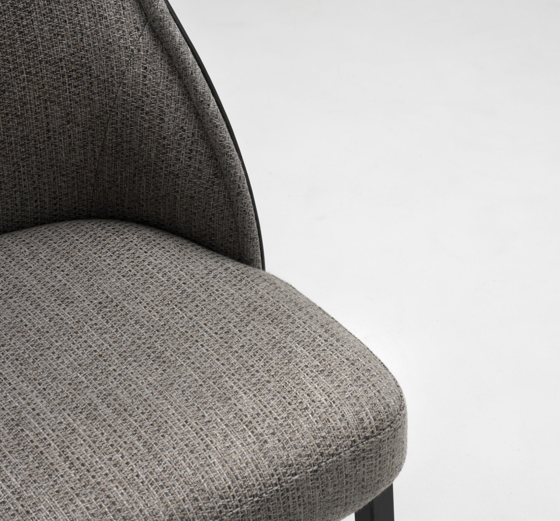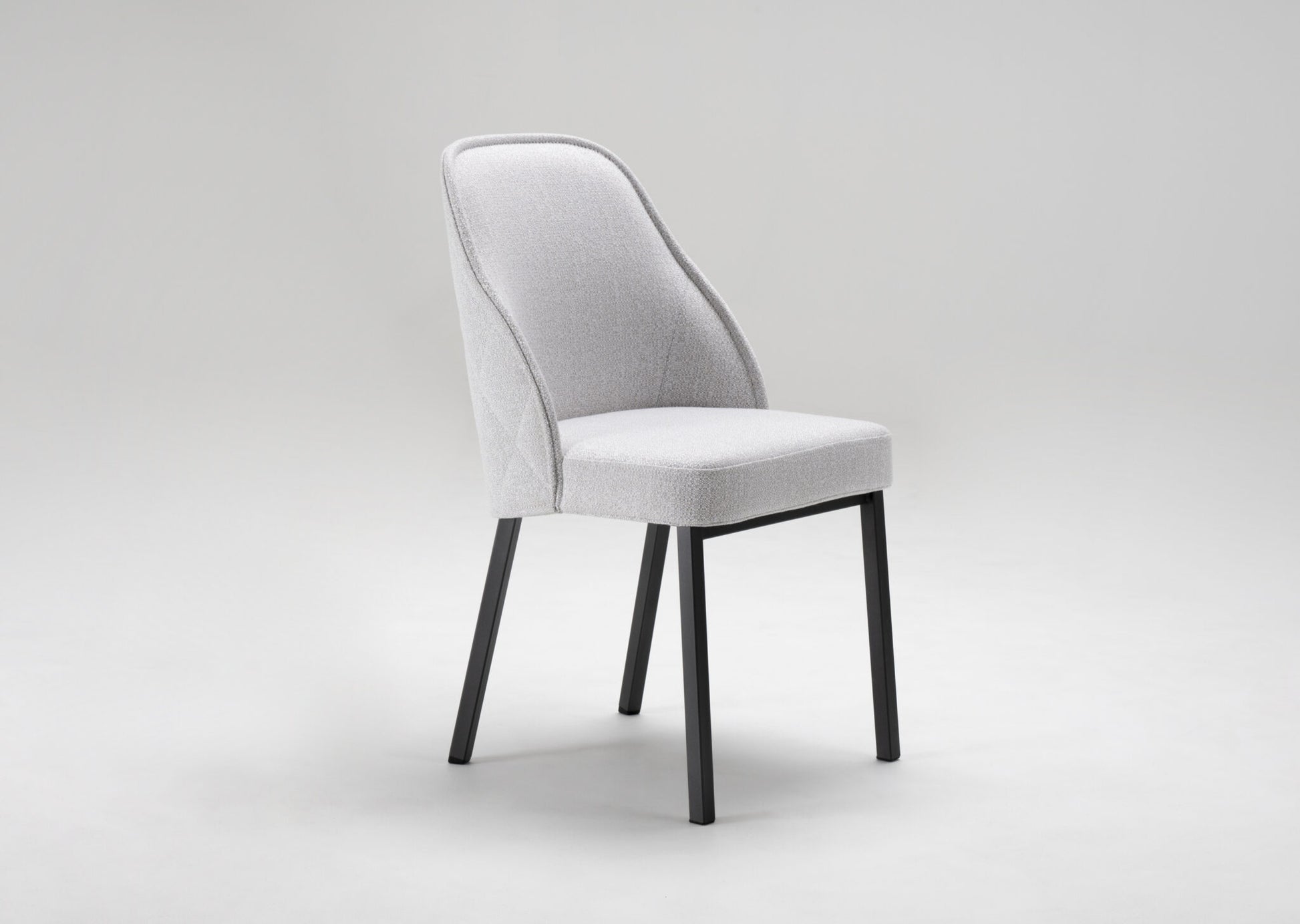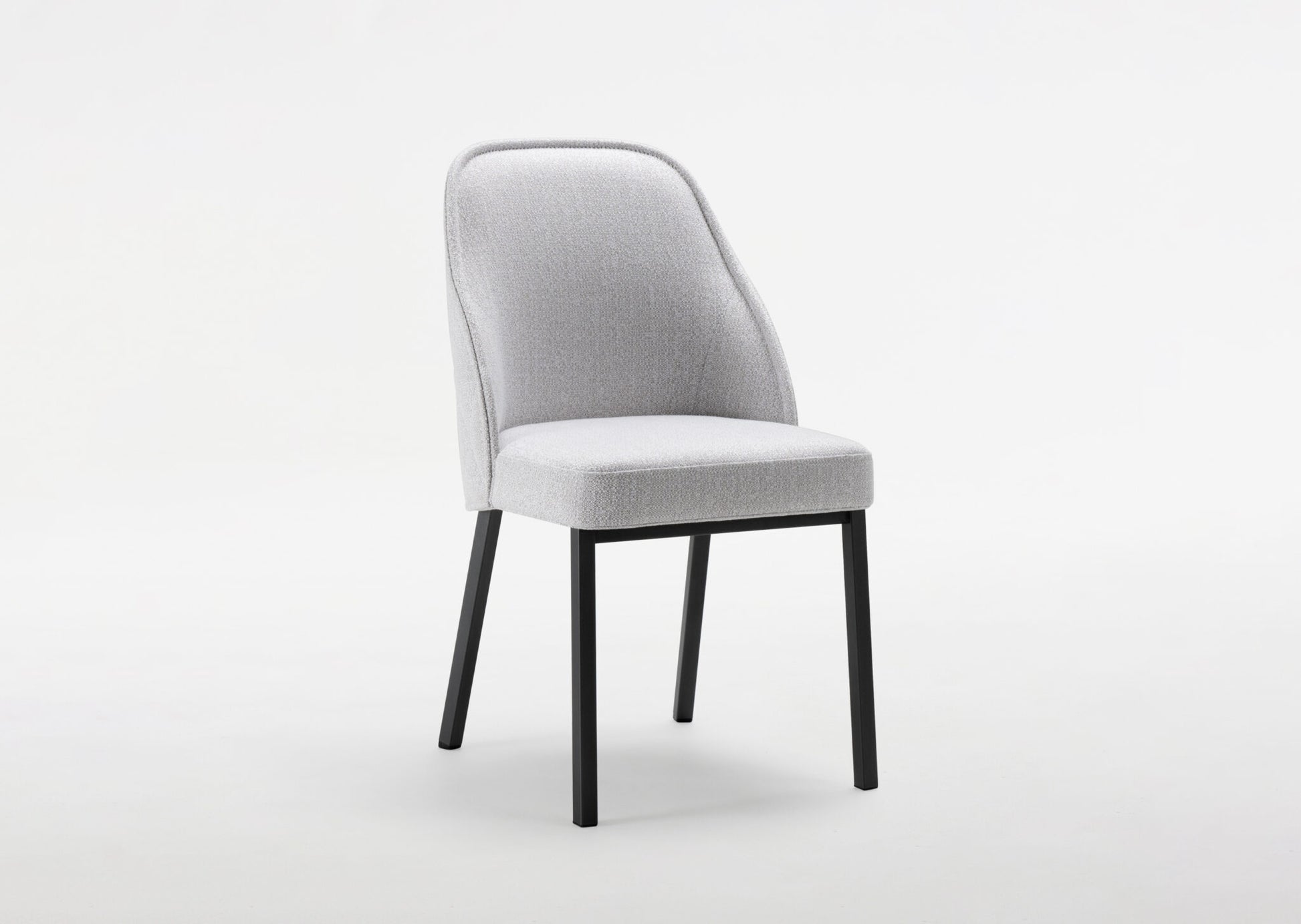 The June chair features a flowing silhouette with high resilience foam padding covered in fabric available in a range of quality textiles. Founded on solid wood or metal legs, this piece combines comfort and elegance, promising to become a refined focal point in any dining or work space.