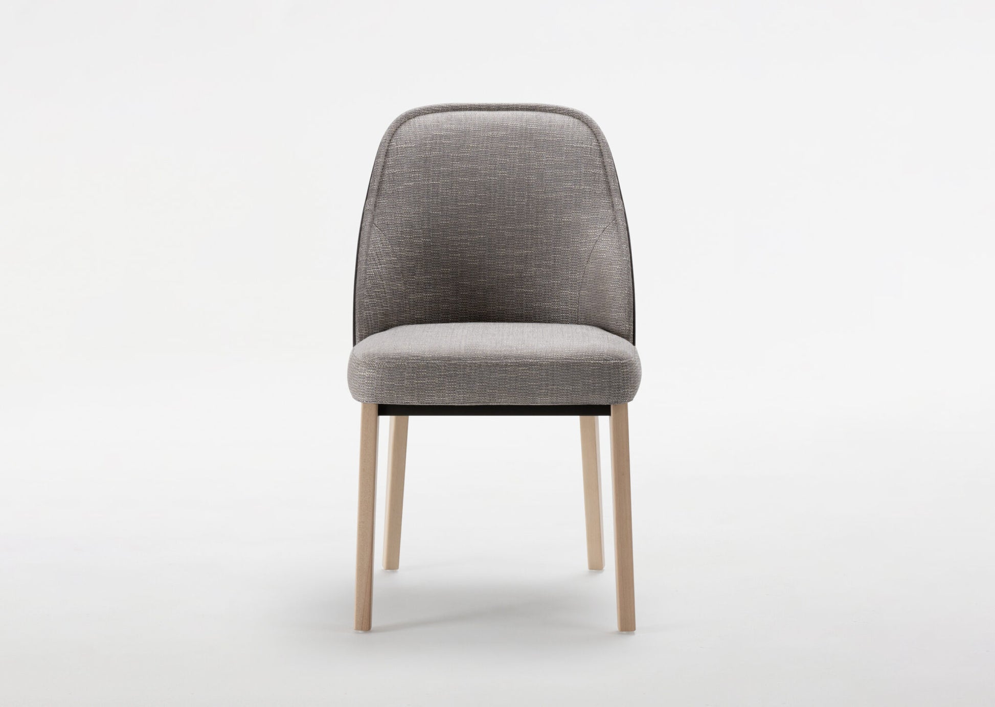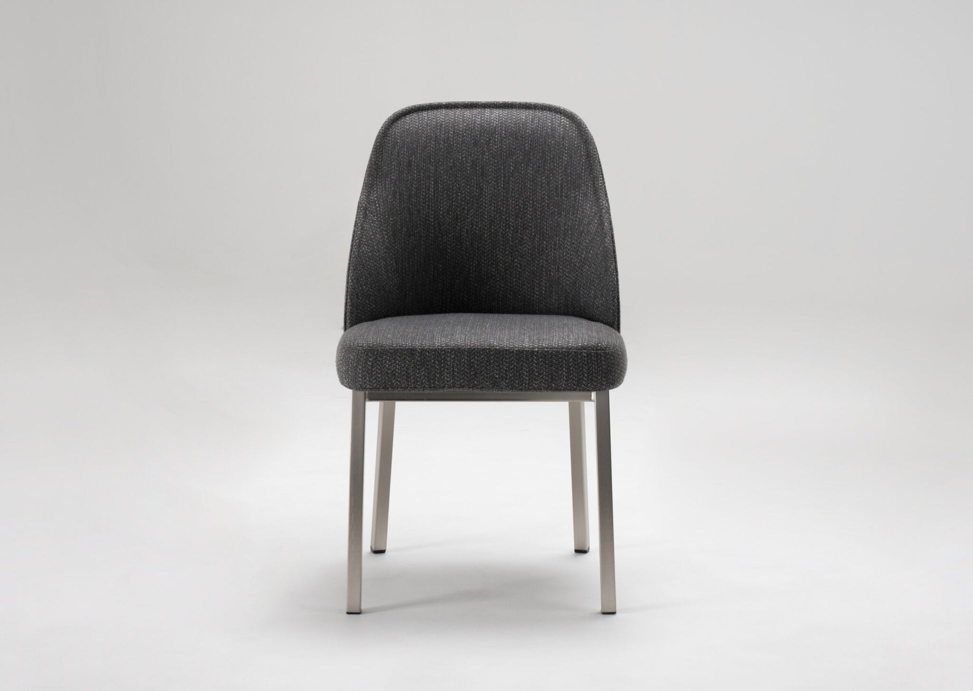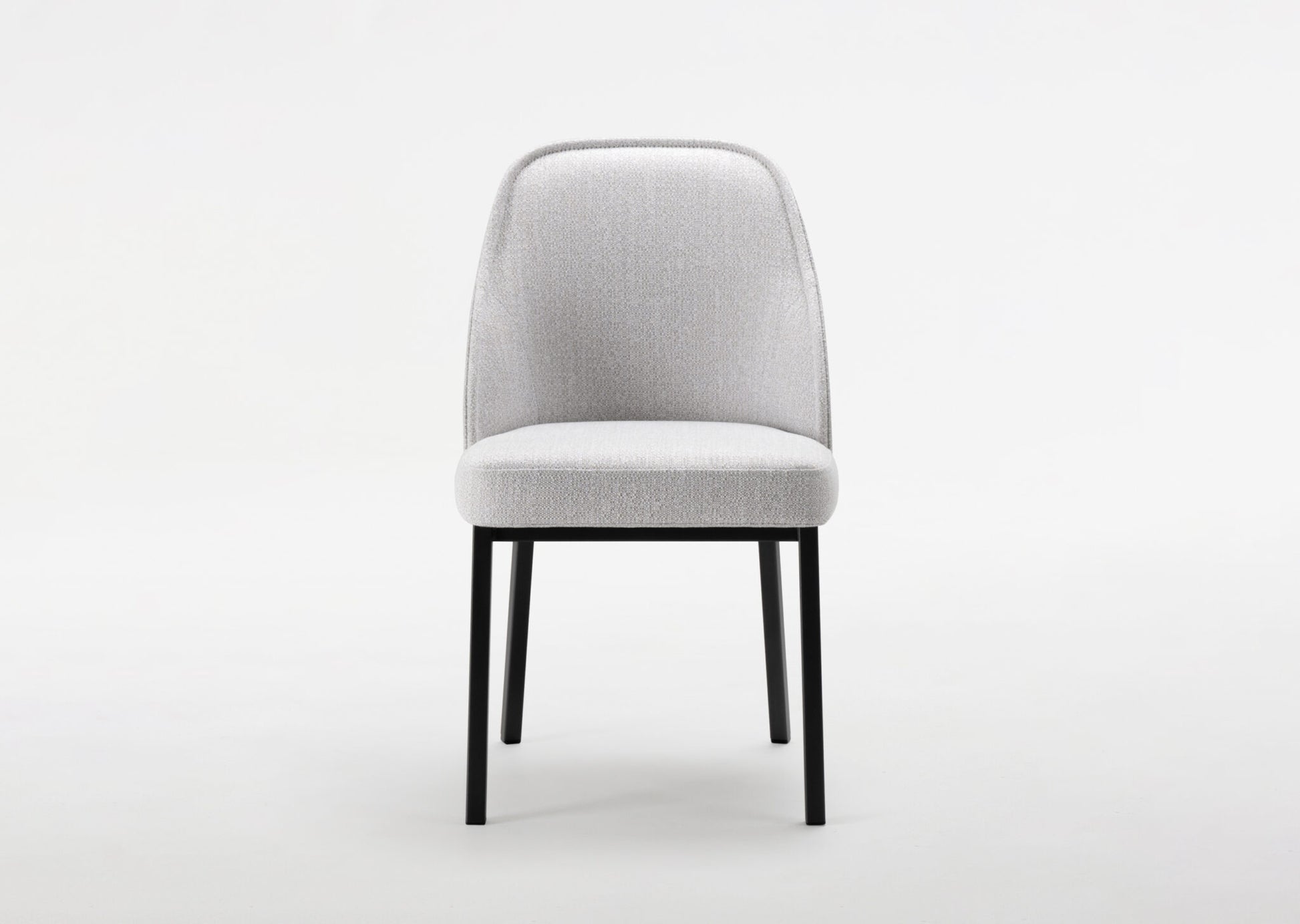 The June chair features a flowing silhouette with high resilience foam padding covered in fabric available in a range of quality textiles. Founded on solid wood or metal legs, this piece combines comfort and elegance, promising to become a refined focal point in any dining or work space.