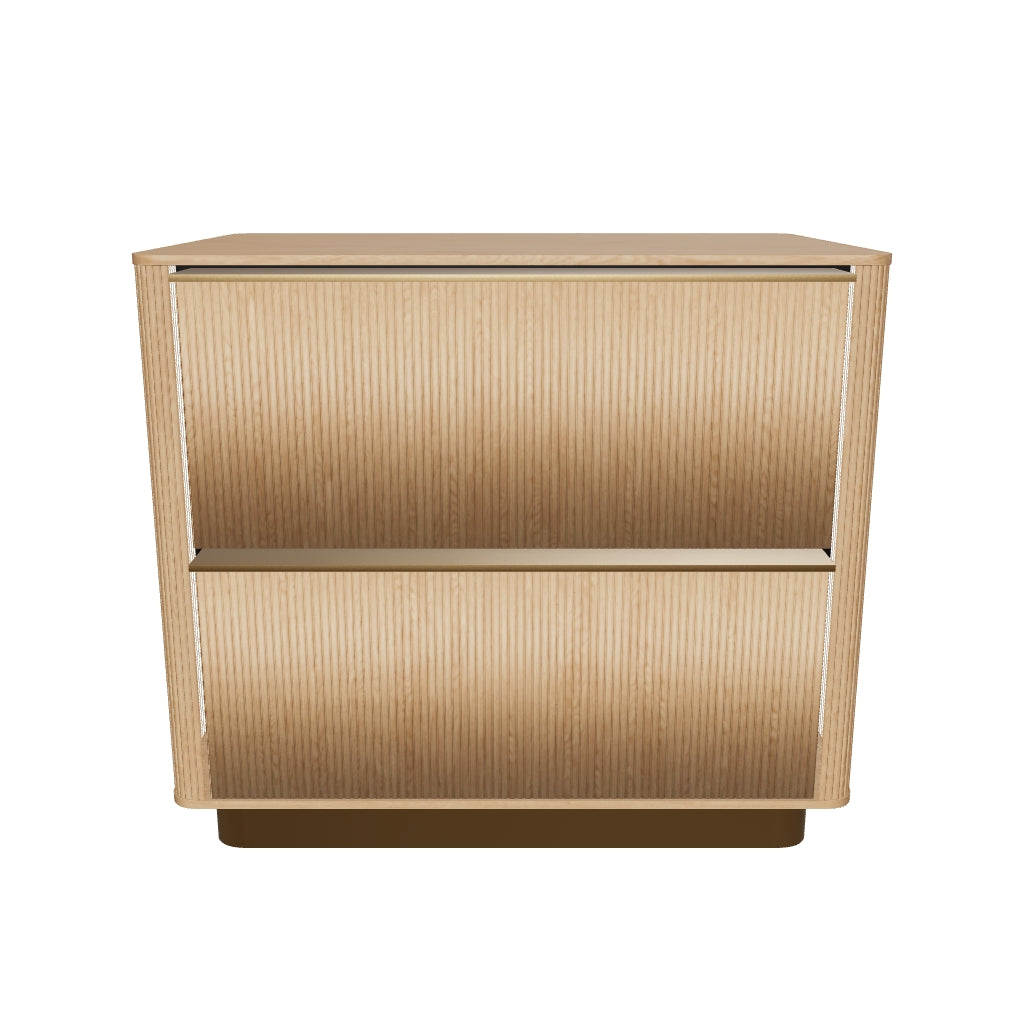 The Kalla Nightstand brings form and function to life. Crafted with a rustic oak veneer with vertical reeding. A gold steel base finishes the look. As wood is an organic, porous material, these pieces will contain natural variation of texture and may also exhibit fine indentations and cracks. Wood pieces will also display a disparity of colour and grain, and visible knots and burls that add to the character of each piece.