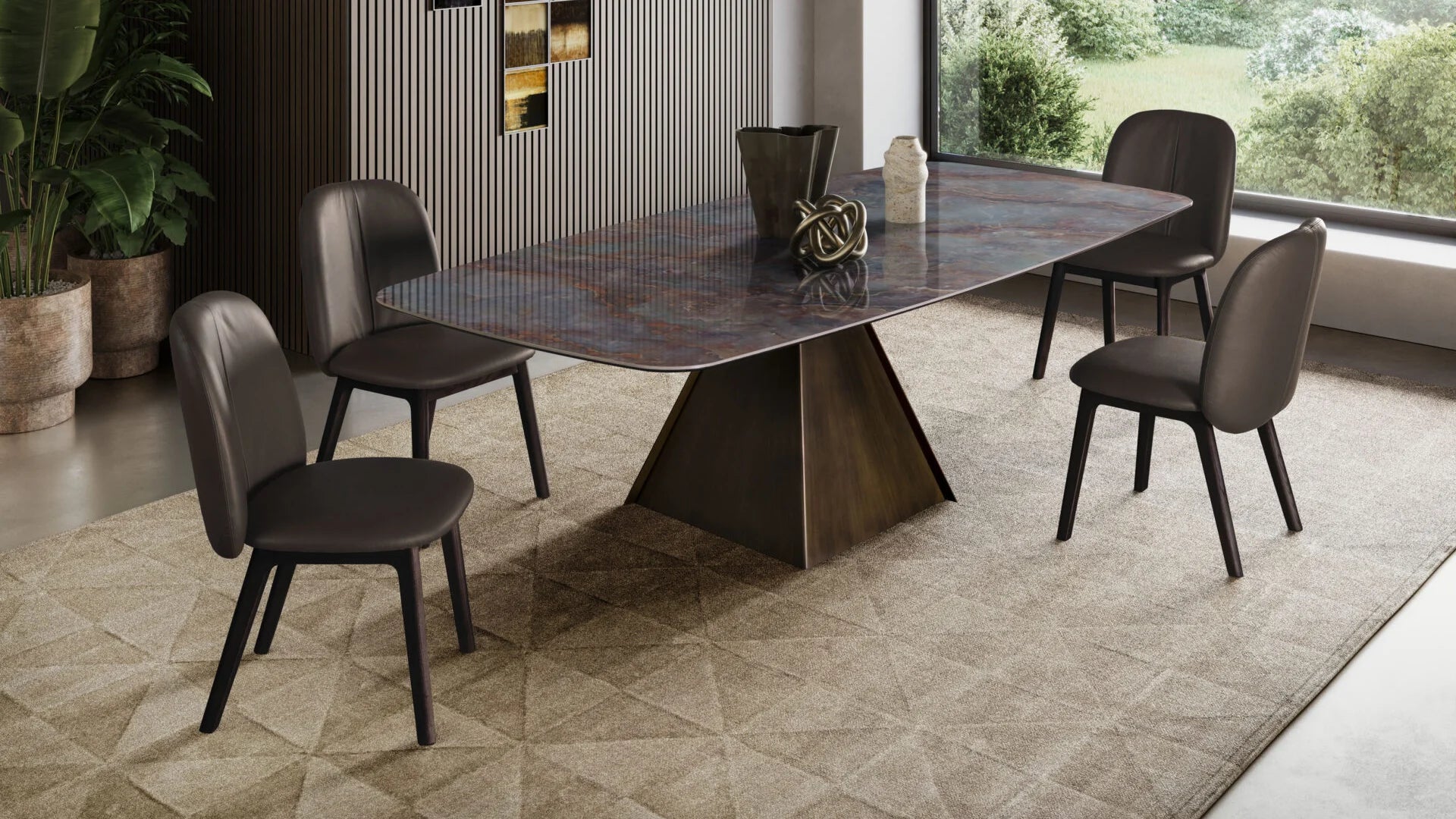 The base of the table, modelled in the shape of a pyramid with folded sheet metal, creates a perfect balance between stability and design, giving the entire piece of furniture a modern aesthetic.