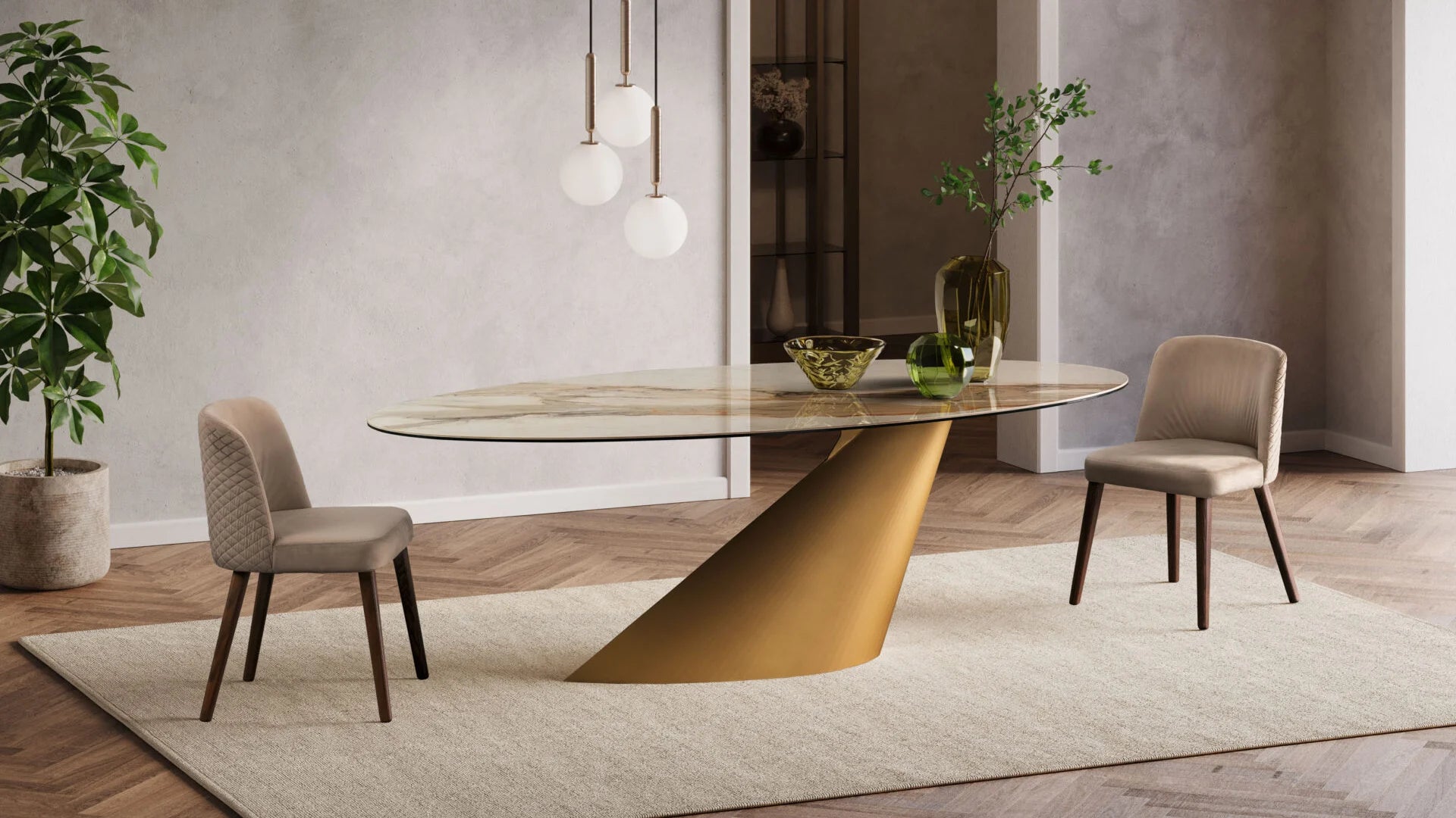 Oslo stands out for its unique personality. With a strong visual impact, it stands out for its original base, which gives the table a light and suspended, almost airy elegance. Perfect for modern and dynamic environments, it combines refined design and fine materials, becoming the undisputed star of the living area.