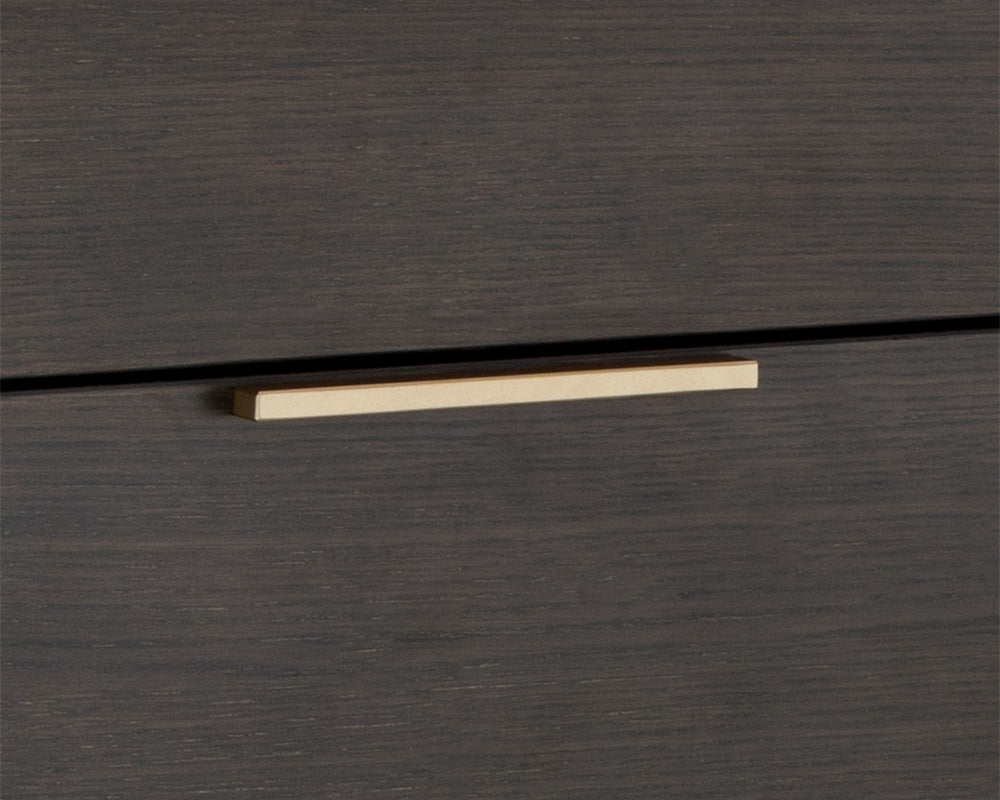 A modern dresser designed to add a beautiful touch to the bedroom. Crafted from charcoal grey oak veneer with six soft closing drawers for ample storage. Brushed gold iron hardware completes the look.