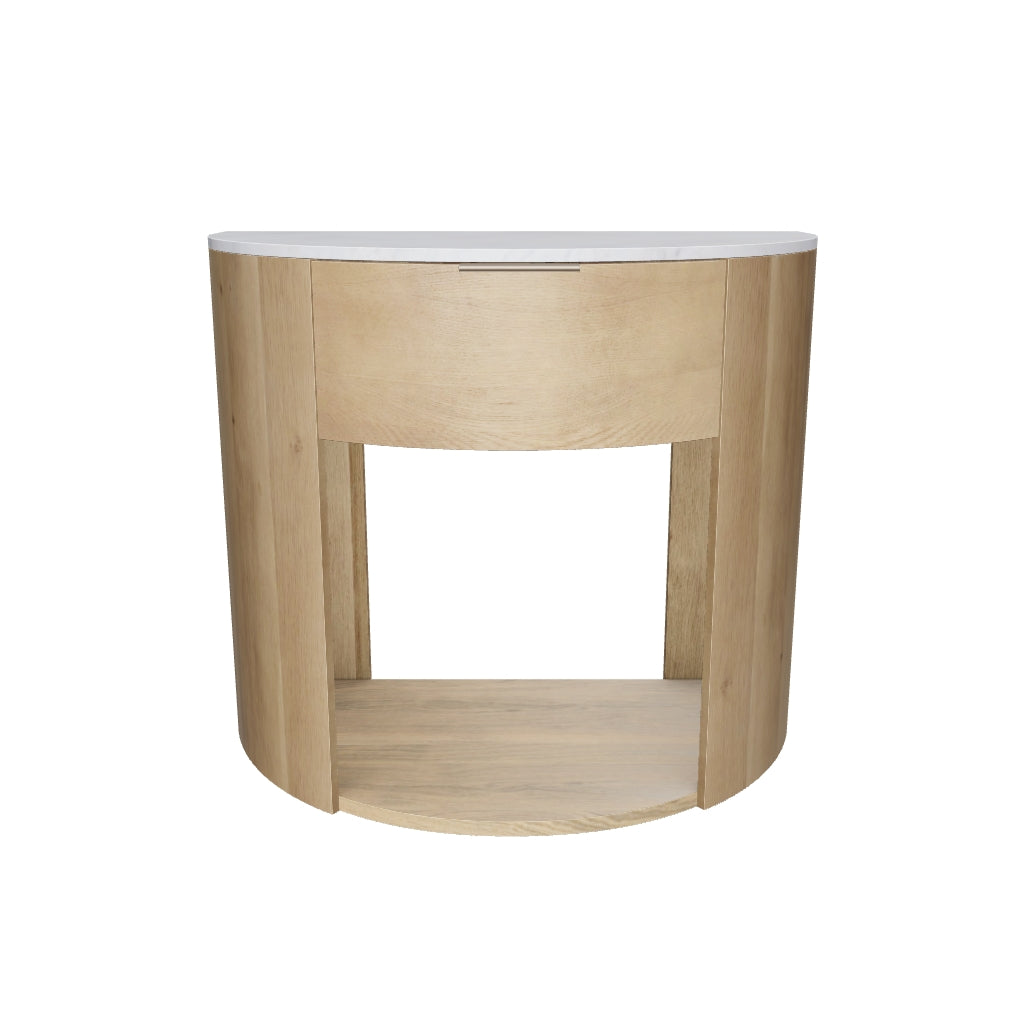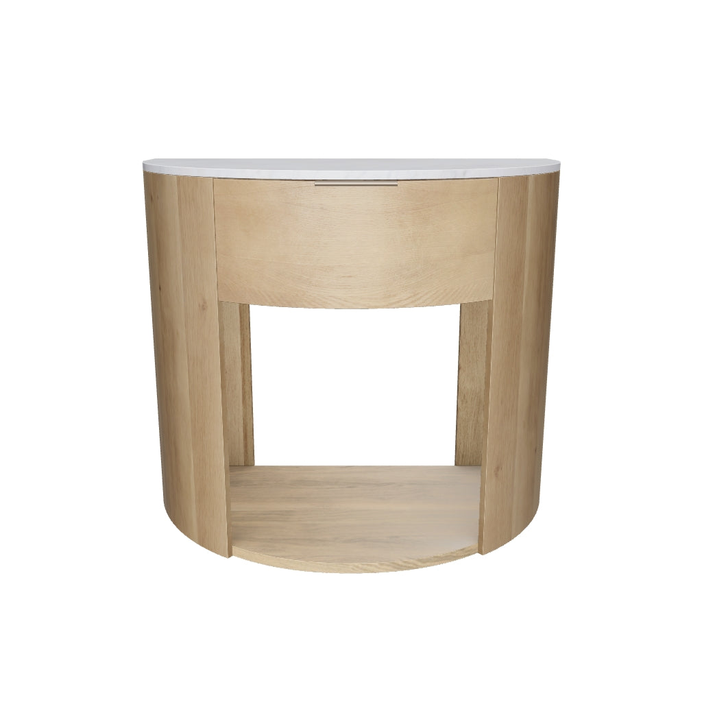 A stylish addition to any space, the Stella Nightstand showcases a stunning display of mixed materials. A smooth white marble table top contrasts beautifully with the rustic oak wood base and drawer. A bottom open shelf provides additional storage room. An antique brass iron handle finishes the design. As marble is a natural material, unique veining, pitting, fissures, micro-cracks and colour variations are all characteristics that add to the uniqueness and beauty of each piece. As wood is an organic, porous material, these pieces will contain natural variation of texture and may also exhibit fine indentations and cracks. Wood pieces will also display a disparity of colour and grain, and visible knots and burls that add to the character of each piece. Made in India. With refined craftsmanship, this design was brought to life by skilled local artisans. Due to the nature of handcraftsmanship, unique imperfections such as fissures, markings and variations in colour and shape are welcomed and appreciated characteristics for a truly one-of-a-kind piece.