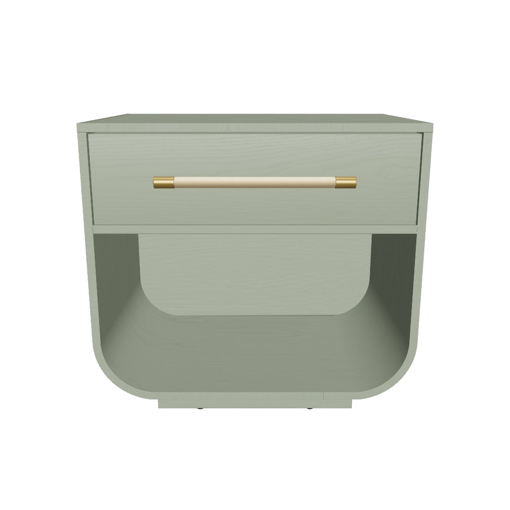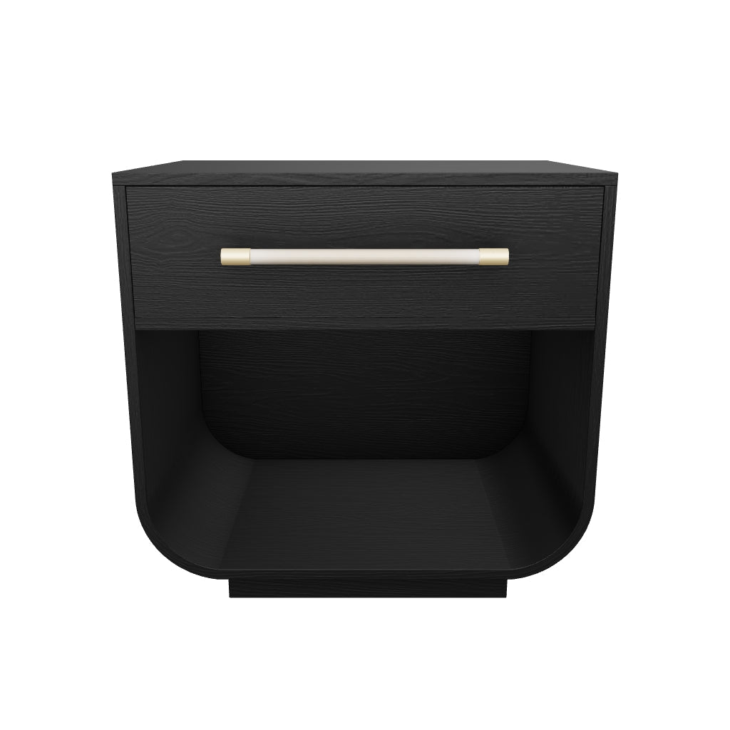 Fluid lines and gentle curves make up the modern silhouette of the Tarrant Nightstand. The raffia wrapped drawer handle adds an understated touch to the black oak veneer base.